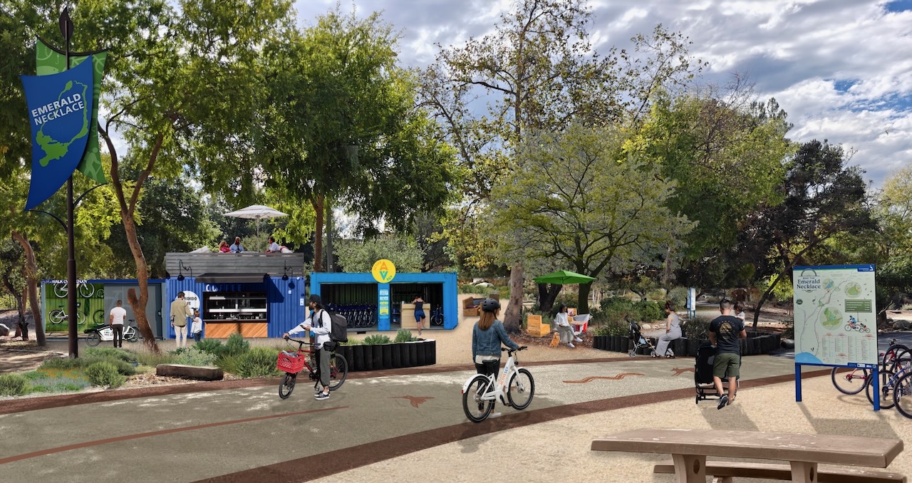 The Emerald Necklace Mobility Hub at Peck Road Water Conservation Park will transform the site of our pop-up events into a welcoming, permanent destination. Planned features include bike parking and repair stations, hydration stations, shaded seating, wayfinding signage, art installations, and accessible paving. The goal is a space that feels inviting, functional, and community-owned.